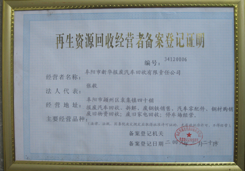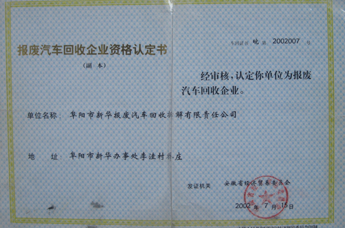 pq3全國車輛報(bào)廢解體辦理中心|車輛報(bào)廢解體|車輛補(bǔ)貼|車輛回收|車輛注銷pq3全國車輛報(bào)廢解體辦理中心|車輛報(bào)廢解體|車輛補(bǔ)貼|車輛回收|車輛注銷pq3全國車輛報(bào)廢解體辦理中心|車輛報(bào)廢解體|車輛補(bǔ)貼|車輛回收|車輛注銷 阜陽市華成再生資源綜合利用有限公司成立于二O一二年九月八日,系玉成(北京)有限公司控股收購阜陽市新華報(bào)廢汽車回收拆解有限責(zé)任公司后新組建企業(yè),歸口阜陽市商務(wù)局,是取得國家資格認(rèn)定的阜陽市合法的報(bào)廢汽車回收拆解企業(yè),承載阜陽市三區(qū)五縣的報(bào)廢汽車的回收拆解任務(wù)。