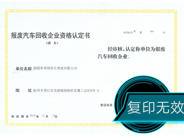 福建省晉翔再生資源有限公司主要經(jīng)營:廢舊汽車回收、摩托車報(bào)廢、客貨車報(bào)廢、車輛報(bào)廢拆解;船舶的回收;廢舊鋼材和其他金屬性、生產(chǎn)性及非生產(chǎn)性廢金屬性物資的回收及相關(guān)業(yè)務(wù);汽車安全施救拖吊業(yè)務(wù)。