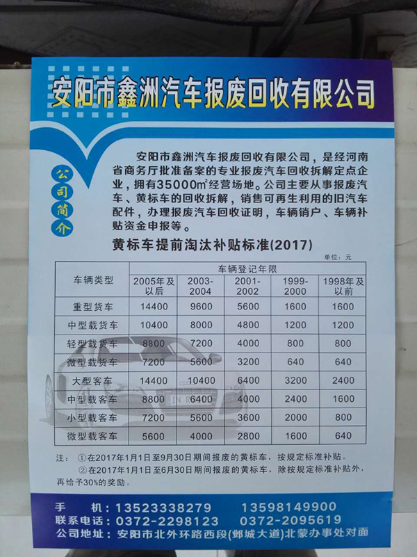 安陽(yáng)市鑫洲汽車報(bào)廢回收有限公司鄭重向您承諾:客戶的來(lái)訪、來(lái)電熱情接待,耐心解答,文明服務(wù),善始善終。 盡我們所能為客戶解決疑難問(wèn)題。公開報(bào)廢汽車收購(gòu)價(jià)格,絕不損害客戶的利益??纱k車輛報(bào)廢一切手續(xù)??蛻舻耐对V我們專人負(fù)責(zé)處理,并予以答復(fù)。