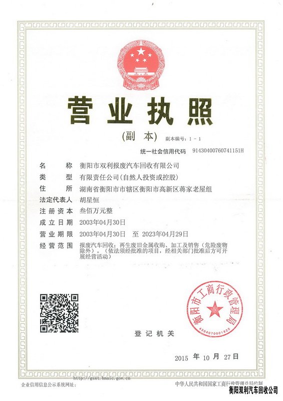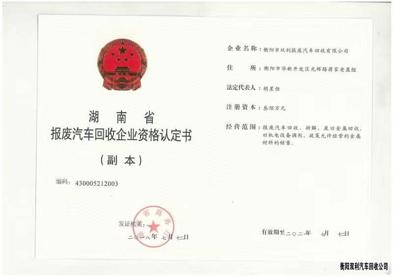 fBw全國車輛報廢解體辦理中心|車輛報廢解體|車輛補貼|車輛回收|車輛注銷fBw全國車輛報廢解體辦理中心|車輛報廢解體|車輛補貼|車輛回收|車輛注銷衡陽市雙利報廢汽車回收有限公司 主要經(jīng)營報廢汽車回收、報廢汽車解體、僵尸車報廢、報廢車輛補貼;再生廢舊金屬收購、加工及銷售(危險廢物除外)。(依法須經(jīng)批準的項目,經(jīng)相關(guān)部門批準后方可開展經(jīng)營活動),公司的報廢車加工及專業(yè)運輸設(shè)備齊全,管理制度健全,操作規(guī)范。技術(shù)人員和從業(yè)人員全部經(jīng)過了國家社會勞動保障部舉辦的執(zhí)業(yè)技術(shù)培訓(xùn),并全部領(lǐng)取了證書。