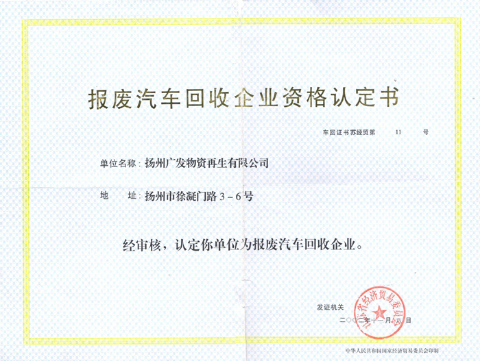 cDr全國車輛報廢解體辦理中心|車輛報廢解體|車輛補貼|車輛回收|車輛注銷cDr全國車輛報廢解體辦理中心|車輛報廢解體|車輛補貼|車輛回收|車輛注銷揚州廣發(fā)物資再生有限公司成立于2002年1月,注冊資本3000萬元,經(jīng)營場地位于揚州市邗江區(qū)楊廟鎮(zhèn)趙莊村占地面積58000平方米,其中:標(biāo)準(zhǔn)化生產(chǎn)車間9000平方米,舊零件倉庫4500平方米,報廢機動車硬化存貯場地13000平方米,綜合辦公大樓6000平方米,附屬庫房2700平方米。公司現(xiàn)有員工42人,其中專業(yè)技術(shù)人員11名,建有“揚州市報廢汽車綠色回收技術(shù)與設(shè)備工程技術(shù)研究中心”、武漢大學(xué)汽車工程學(xué)院合作基地。公司現(xiàn)有發(fā)明專利1項,實用新型專利3項。