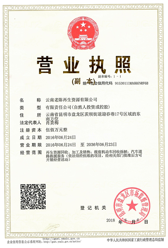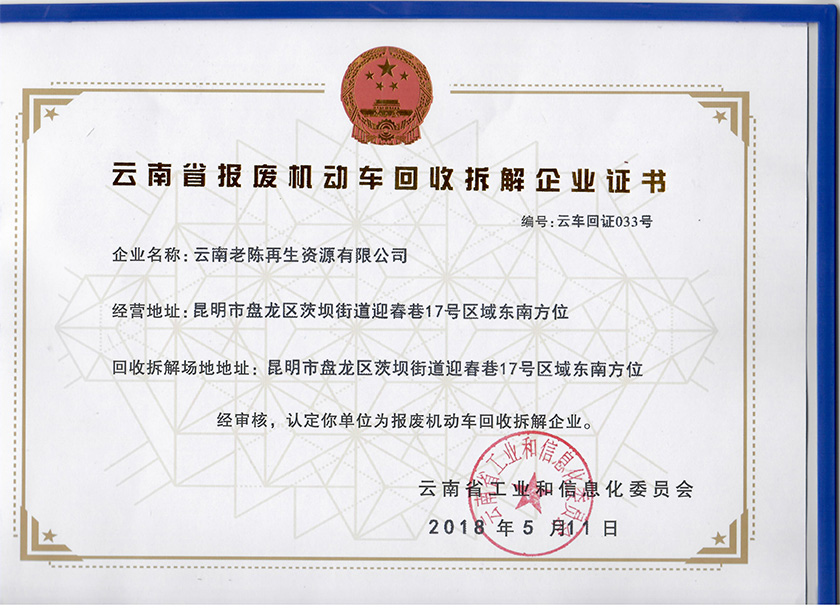 LyG全國(guó)車輛報(bào)廢解體辦理中心|車輛報(bào)廢解體|車輛補(bǔ)貼|車輛回收|車輛注銷LyG全國(guó)車輛報(bào)廢解體辦理中心|車輛報(bào)廢解體|車輛補(bǔ)貼|車輛回收|車輛注銷 云南老陳再生資源有限公司主要業(yè)務(wù)是汽車報(bào)廢和報(bào)廢汽車回收,公司是經(jīng)相關(guān)單位批準(zhǔn)的正規(guī)汽車報(bào)廢和汽車注銷的公司,公司是依照車管所相關(guān)汽車報(bào)廢的流程和方法來辦理汽車報(bào)廢。云南老陳再生資源有限公司成立于2016年,注冊(cè)地址為:云南省昆明市盤龍區(qū)茨壩街道迎春巷17號(hào)區(qū)域的東南方位,注冊(cè)資本:500萬(wàn)元;公司主要經(jīng)營(yíng)報(bào)廢汽車回收、報(bào)廢汽車拆解。